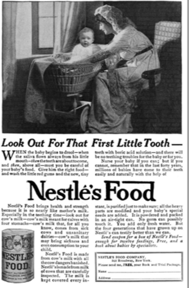 圖片來源:百度百科,20世紀(jì)10年代雀巢奶粉廣告,宣稱配方奶很接近“母乳”。